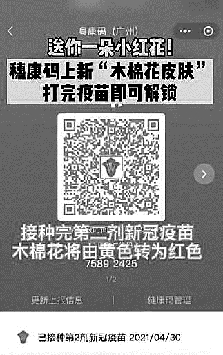 5月6日,接种过新冠疫苗的广东广州市民发现,“穗康码”上多了朵小木棉花。原来,5月5日,“穗康码”全新升级,接种完第一剂新冠疫苗,“穗康码”中间显示一朵黄色木棉花;接种完第二剂,木棉花由黄色转为红色。“穗康码”下方还将显示接种针次和时间。