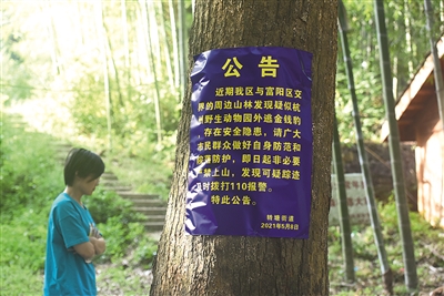 | 5月9日,在杭州市西湖区何家村拍摄的有关出逃金钱豹的公告。 新华社 |