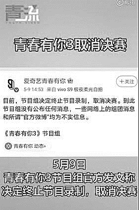 5月9日,据@爱奇艺青春有你(爱奇艺《青春有你》官方微博)发布:节目组决定终止节目录制,取消决赛。一些网络上的组团消息和所谓“官方微博”均为不实信息。