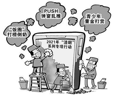 记者5月8日从国新办举行的新闻发布会上获悉,国家网信办部署开展2021年“清朗”系列专项行动,将通过整治网上历史虚无主义、整治未成年人网络环境、整治PUSH弹窗新闻信息突出问题、整治网上文娱及热点排行乱象等8方面内容,在全网开展“大扫除”,力求有效遏制网络乱象滋生蔓延。