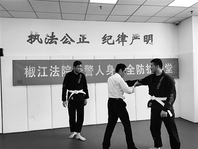为增强法院干警应对处置安全风险能力,台州市椒江区法院近日开办“干警人身安全防护课堂”。参课干警通过现场观摩演练,掌握了部分人身安防技巧。