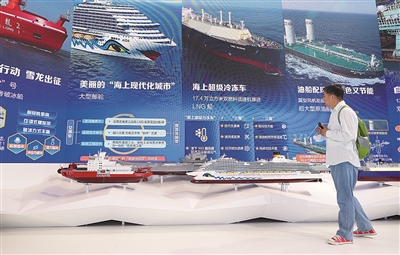 5月10日,参观者在观看船舶模型展品。