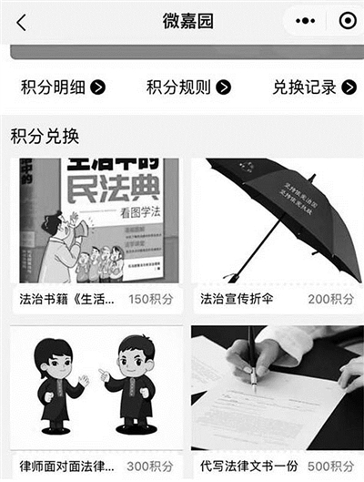 近日,海宁市盐官镇在嘉兴首推“微嘉园”法治礼包兑换服务,用小积分撬动“大普法”。该镇每个村(社区)的“微嘉园”小程序积分商城都上架法治礼包,包含法治书籍、法治宣传用品、律师面对面法律咨询和法律文书代写等。百姓通过“微嘉园”阅读文章、参与志愿活动等获取积分,即可兑换法治产品。对于法律咨询及文书代写,兑换点所在的司法所后续将进行满意度回访,以保证法治产品质量。
