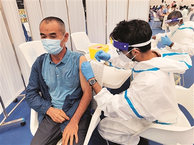 5月11日,一名旅居毛里求斯的中国公民(左)在毛里求斯莫卡区的国家综合体育中心接种新冠疫苗。