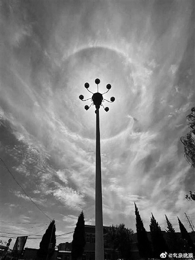 5月16日,北京上空日华+日晕+环地平弧。据@中国国家地理(《中国国家地理》官方微博)科普:环地平弧像一条近乎平直的“一字形”彩虹,虽然颜色和彩虹相似,但成因却不相同:彩虹是由水滴反射阳光形成的,环地平弧是冰晶将日光折射后形成的。