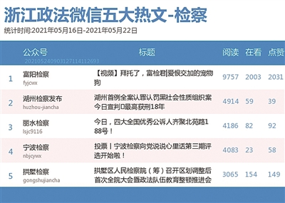 本期检察榜,“富阳检察”获“双料冠军”,该公众号《【视频】拜托了,富检君|爱恨交加的宠物狗》一文,通过诙谐、幽默的短视频,阐述了《民法典》与宠物相关的法律知识,获广泛关注。