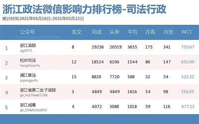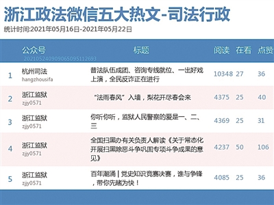 本期司法行政榜,“浙江监狱”摘得桂冠。热文榜上,“杭州司法”《普法队伍成团、咨询专线就位、一出好戏上演,全民反诈正在进行》位居榜首。为遏制电信网络诈骗案,杭州市富阳区开展了专项行动,“杭州司法”及时跟进,获广泛关注。