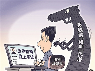 “‘阿里笔试’‘腾讯笔试’,保正确率,老字号,包过进面试。”眼下正值招聘求职旺季,竞争十分激烈。因疫情防控需要,招聘企业广泛设置网络笔试环节。记者调查发现,当前网上存在不少向应聘者提供各类企业特别是知名互联网企业网络笔试代助考舞弊服务的“枪手”,严重影响招聘工作公平公正。新华社 徐骏 作