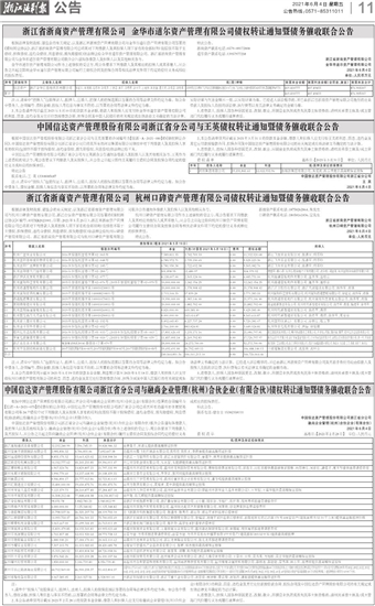 浙江省浙商资产管理有限公司 杭州口碑资产管理有限公司债权转让通知暨债务催收联合公告