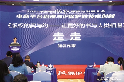 | 在2021网络版权保护与发展大会“电商平台治理与IP保护的技术创新”分论坛上,加入“众声创作者计划”的知名作家走走做主题发言。 |