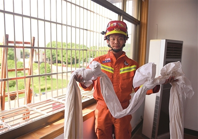 “两条床单互相打结后,露出的一头处应再多打一个保护结……”消防员告诉记者,用床单打结时,一定要控制好距离,否则容易在下滑时出现踩空;而每个结头上的保护结,可以防止床单承重后结滑开,出现意外情况。