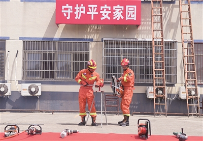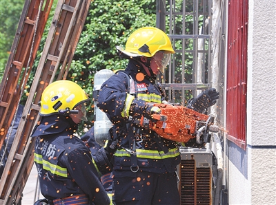“这种1楼的破拆救援是最没难度的,要是再高几层楼的话,破拆难度会大大增加,这也就会相应增加被困人员的危险。”说着,在多名消防员的保护下,1名负责破拆的消防员一手提着无齿锯,一手扶着拉梯,爬到二楼窗口,模拟破拆救援。