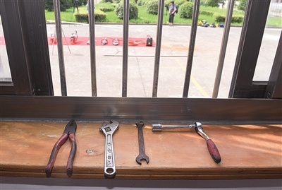考虑普通家庭的实际情况,本次实验配备了多功能扳手、榔头、撬棍等常用家庭工具,并选择了一组最普通的内嵌式不锈钢防盗窗,通过燃放烟雾弹模拟火灾,再分别用不同工具进行逃生自救演示。