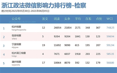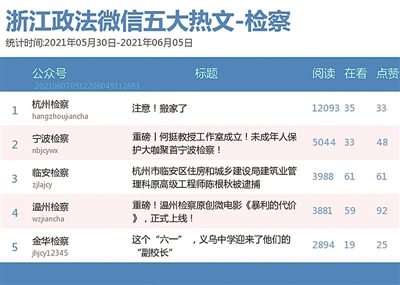 本期检察院榜,“杭州检察”继续登顶。热文榜中,“温州检察”的《重磅!温州检察原创微电影〈暴利的代价〉,正式上线!》一文,推出了由真实事件改编的金融犯罪题材微电影,值得一看。