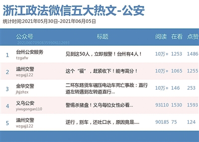 本期公安榜,“杭州公安”同样蝉联榜单第一。热文榜上,阅读数达“10万+”的好文共有3篇,分别来自于“台州公安服务”“温州交警”“金华交警”。“义乌公安”的《警惕杀猪盘!义乌每位女性必看…》一文揭秘了杀猪盘诈骗套路,值得一看。
