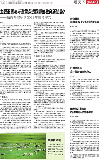 高考也是教育的重要环节。张彬福认为,近年来高考作文题更加直面现实关切,引导教师、学生关注火热的时代和国家的最新发展。包括“假如我与心中的英雄生活一天”“共和国,我为你拍照”“新时代新青年”等,都体现出了一以贯之的教育追求目标。把握时代脉动、关注社会时事的考生,才有可能获得优异成绩。