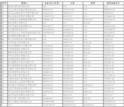 单位:人民币元 注:1、在基准日前发生的代垫费用人民币249877元与标的债权一并转让。 2、清单中“担保人”包括保证人、抵押人、出质人,担保人的担保范围以签署的合同等法律文件约定为准。如公告中债务人、合同编号、债权金额、担保人等信息与事实不符的,以签署的合同等法律文件约定为准。 3、本公告清单列示截至2021年4月20日的贷款本金余额,借款人和担保人应支付给浙江省浙商资产管理有限公司的利息、罚息、违约金及其它应付款按借款合同、担保合同及中国人民银行的有关规定或生效法律文书确定的方法计算,实际计算与欠息金额不一致,以实际计算为准。已经进入诉讼程序的,并已由中国华融资产管理股份有限公司浙江省分公司垫付的应由借款人及担保人负担的诉讼费、执行费等以有关法律文书确定的金额为准。 4、若借款人、担保人因各种原因更名、改制、歇业、吊销营业执照或丧失民事主体资格的,请相关承债主体及/或主管部门代位履行义务或履行清算责任。 |