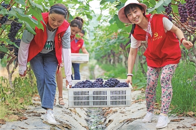 近日,长兴县夹浦镇香山村葡萄产业帮扶基地,党员和青年志愿者帮助低收入农户采摘成熟的葡萄。受气温影响,今年葡萄上市时间比去年提早了半个多月,当地党员和青年志愿者成立助农服务队,助农采收、运输、联系销路。