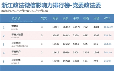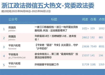 政法委榜上,“微嘉园”夺魁,该公众号有两篇文章入围热文榜前三甲,其中《一家三口核酸阳性!浙江一地开展全员核酸检测……网友:这些画面看哭了》一文以10万+的阅读数拿下冠军。6月10日,温州发布境外输入确诊病例及其关联病例的通报,医务人员连夜集结,开展全员核酸检测。“微嘉园”对此新闻进行转发分享,收获众多网友关注。