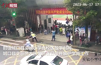 6月17日下午,时值重庆市城口县实验小学北校区放学时间,城口县公安局交巡警大队民警在日常开展护学岗工作时,发现一名小学生闯红灯,此时迎面而来一辆电动车,幸亏民警及时反应,“一秒”将学生拉回,避免一起交通事故的发生。