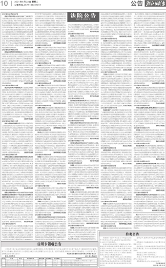 (2021)浙0483民初1948号 徐锐(公民身份号码330723198512094131):本院受理原告苗华春与被告徐锐加工合同纠纷一案,现已经审理终结。现依照《中华人民共和国民事诉讼法》第九十二条之规定,向你公告送达(2021)浙0483民初1948号民事判决书。限你自公告之日起60日内来本院领取民事判决书,逾期即视为送达。如不服本判决,可在公告期满后十五日内,向本院递交上诉状及副本,上诉于浙江省嘉兴市中级人民法院。逾期本判决即发生法律效力。桐乡市人民法院(2021)浙0483民初3414号 郑小珍(公民身份号码330327198604194408):本院受理原告李洪侠诉被告郑小珍买卖合同纠纷一案,现依法向你公告送达起诉状副本、证据副本、应诉通知书、举证通知书、转换程序材料、合议庭组成人员通知书、及开庭传票等。自本公告发出之日起,经过60日,即视为送达。提出答辩状的期限为公告送达期满后的15日内,举证期限为公告送达期满后的30日内。本案定于举证期限届满后的第3日下午14时30分(遇节假日顺延)在本院濮院法庭第一法庭开庭审理,逾期将依法判决。桐乡市人民法院