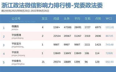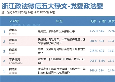 本期政法委榜上,“微嘉园”不仅夺得了影响力排行榜冠军,更是独占了热文榜单前三名。《最高法、最高检和公安部再出手》一文,向读者介绍了国家对电信网络诈骗犯罪实行的全链条、全方位打击,获得了最高阅读量。