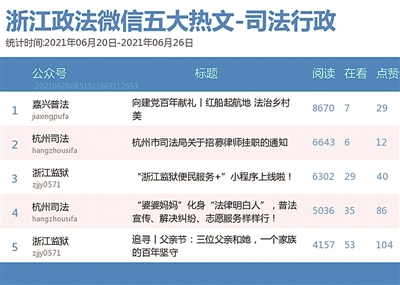 本期司法行政榜上,“浙江监狱”继续独占鳌头。热文榜上,“嘉兴普法”发布的《向建党百年献礼丨红船起航地 法治乡村美》,用一首MV歌咏新时代江南水乡“美丽乡村、法治更美”的美好画卷,向党的百年华诞献礼!