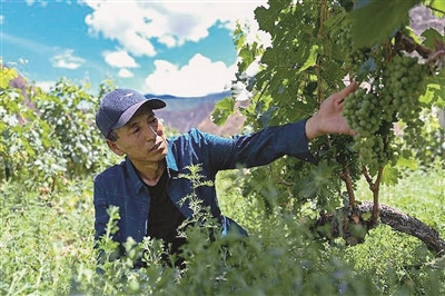 引水到田后,吾堆家的葡萄长势喜人,饱满的果实挂满枝头。“以前只有4亩葡萄地,现在水来了,我在荒地上也种了葡萄,一共有7亩多。”看着葡萄越结越好,吾堆自己酿起了酒,卖给过路游客,一年收入有10万多元。