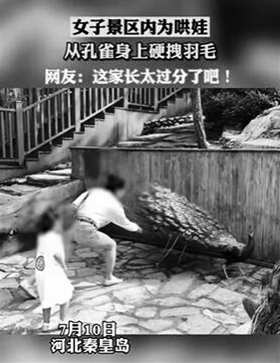 7月10日晚,有网友在社交平台发布视频称,在河北秦皇岛燕塞湖景区内,一个带着孩子的女游客在景区观赏孔雀时,硬拽了一根孔雀羽毛,对此该网友表示:“身为人母,不能这么教育孩子。”11日上午,该景区回复记者称,暂未发现孔雀受伤,保留对该游客的追诉权。