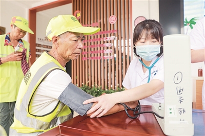 7月12日,长兴县洪桥镇清凉小站内,镇卫生院志愿者为户外一线工作人员义诊。高温季节,洪桥镇设立清凉小站,向环卫工人、城管队员等一线工人免费提供饮水机、自助药箱、自制凉茶等防暑降温用具物品,并组织医务人员定期开展义诊,为他们送去夏日清凉。谭云俸 王夕鸣 摄