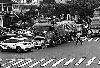 本报讯 眼看老人要被大货车卷进车底,千钧一发之际,一辆警车横在了大货车前面,救了老人一命!这一幕发生在近日的海宁街头。
