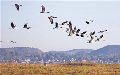| 黑颈鹤在贵州草海国家级自然保护区飞翔 |