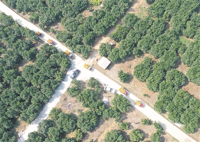 | 在广西罗城仫佬族自治县金玉柚生态产业扶贫示范区,装载柚子的车辆在柚子园内行驶 |