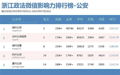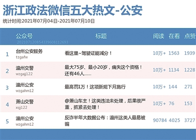 本期公安榜,“温州公安”位列第一。热文榜上,有4篇阅读量达“10万+”的文章,其中“台州公安服务”的《看这里~驾驶证能减分!》获得较高在看和点赞数。驾驶员们可以学习下文内的“减分教程”。