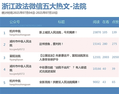 本期法院榜,“杭州中院”再次蝉联第一。热文榜上,“富阳法院”的《【以案说法】向家暴说不,富阳法院发出人身安全保护令》一文获得最多点赞。