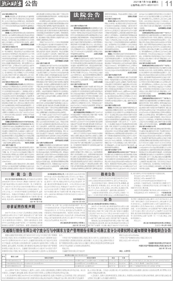 本院定于2021年9月14日上午10时在东阳市人民法院第六审判庭召开第一次债权人会议。依法申报债权的债权人有权参加债权人会议。注:债权申报时须提交的资料:(1)债权人登记债权数额时需提供相关证据,证据为一式两份的复印件,并提交原件核对;(2)债权人系法人或其他组织的,应提交营业执照、法定代表人或负责人身份证明书;(3)债权人系自然人的,应提交个人身份证明;(4)如债权人委托代理人进行债权申报的,应提交特别授权委托书、委托代理人的身份证件或律师执业证,委托代理人是律师的还应提交律师事务所的指派函。参加会议的债权人需提交上述资料:(2)、(3)、(4)。东阳市人民法院