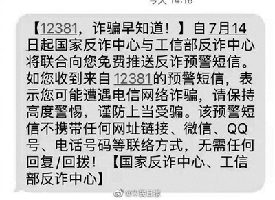 据@平安北京(北京市公安局官方微博),国家反诈中心与工信部反诈中心将联合向公众免费推送反诈预警短信。如收到来自12381的预警短信,表示可能遭遇电信网络诈骗,请保持高度警惕,谨防上当受骗。该预警短信不携带任何网址链接、微信、QQ号、电话号码等联络方式,无需任何回复或回拨。