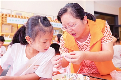 近日,教师志愿者在诸暨市浣东街道东盛社区指导小朋友包饺子。暑期开始,东盛社区在辖区范围内招募志愿者,免费轮班到社区夏令营课堂带教小朋友,课程设置丰富多彩,涉及民俗知识、手工制作、体育活动、反诈安全教育等内容,既丰富了孩子们的暑期生活,也解决了“暑期托管”难题。新华社 郭斌 摄