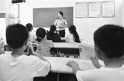 近日,台州火车站警务室民警和亭旁派出所民警,会同浙江省金融学院国际商学院大学生实践团,来到亭旁镇芹溪村开展“童心向党、筑梦未来”关爱留守儿童活动。图为民警为留守儿童讲解安全知识。