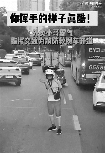 你挥手的样子真帅! 外卖小哥霸气指挥为消防车开路