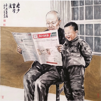 方方正正的纸张里,画着一老一小,老人端坐在竹椅上,微微颔首,聚精会神地读着《浙江法制报》;一旁的孩童背着手、咧着嘴,看向报纸的眼睛笑得眯成了一条缝,二人之间组成了一幅温馨和谐的学法场景。“我想通过这个画面,展现人人学法、全民普法的热潮。”对《老少皆学法》这幅画,金惠民颇为满意。