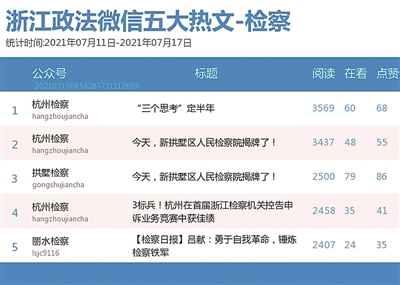 本期检察院榜,“杭州检察”在前两周短暂“失利”后,本期表现尤为出色,不仅荣登两榜榜首,且为热文榜前五名贡献了3篇好文,分别是《“三个思考”定半年》《今天,新拱墅区人民检察院揭牌了!》《3标兵!杭州在首届浙江检察机关控告申诉业务竞赛中获佳绩》。