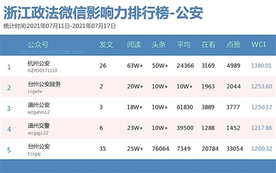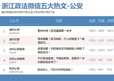 本期公安榜,排名前三的依次是“杭州公安”“台州公安服务”“温州公安”。热文榜上“10万+”的好文霸屏,其中“温州公安”发布的《警钟长鸣!防范暑期第一杀手》,阅读量、在看数和点赞量均获得第一。夏季高温来袭,警方呼吁大家,珍爱生命,谨防溺水。