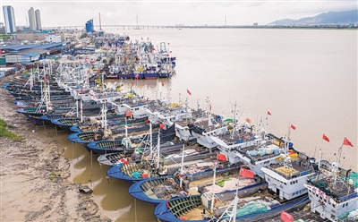 今年第6号台风“烟花”逼近,7月20日,瑞安市东山渔港码头,700多艘渔船停靠在码头避风,渔民用绳索加固船只。孙凛 摄