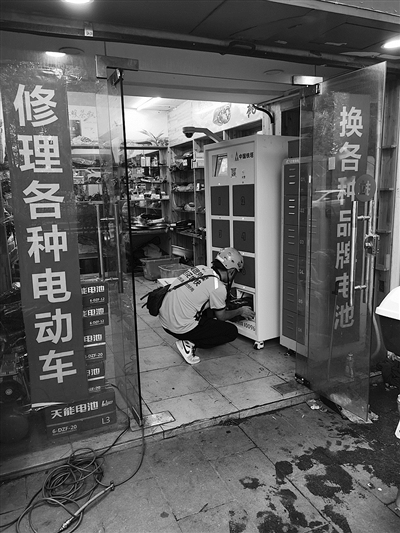 | 外卖小哥在店铺的锂电池租赁点换电池 |