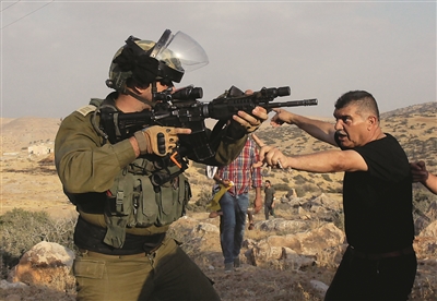 7月24日,抗议以色列扩建犹太人定居点的巴勒斯坦人与以色列士兵在约旦河西岸城市图巴斯对峙。