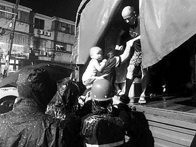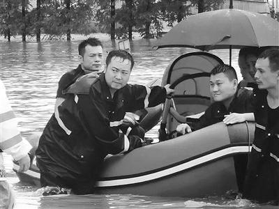 26日上午11时,武警宁波支队110名战士在参谋长卞高明的带领下,携带4艘冲锋舟、7艘橡皮艇奔赴内涝情况严重的阳明街道,为当地加固堤坝、转移受困群众及转运救灾物资提供帮助。