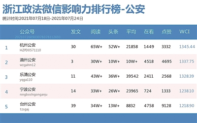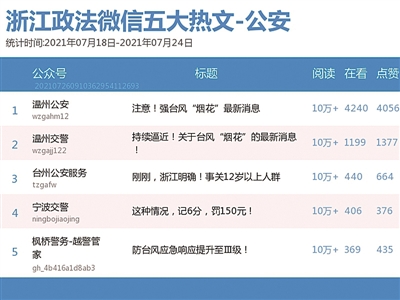 本期公安榜前三名依次是“杭州公安”“温州公安”“乐清公安”。“温州公安”的《注意!强台风“烟花”最新消息》一文获得“10万+”阅读数,拿下热文榜冠军。“烟花”来势汹汹,各地公安机关“闻风而动”,迅速进入战斗状态,全力保护人民群众生命财产安全,成为群众心中最可爱的人。