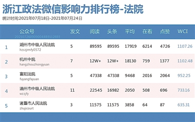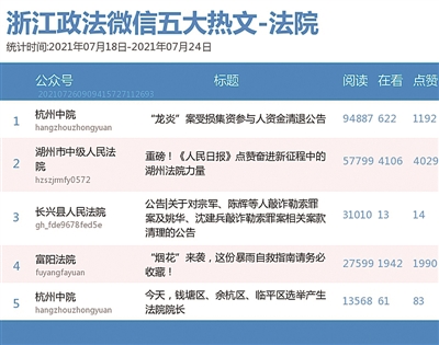 本期法院榜前三甲分别是“湖州市中级人民法院”“杭州中院”“富阳法院”。其中,“杭州中院”的《“龙炎”案受损集资参与人资金清退公告》一文以“94887”的阅读数夺得热文榜第一名。杭州市中级人民法院对“龙炎”案涉财产部分立案执行后,依法有序推进资产处置、资金归集、信息登记和核实审计等工作,受到广泛关注。