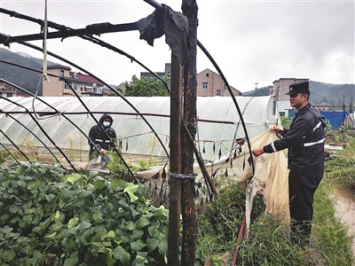 27日上午,受台风“烟花”后续影响,东阳市佐村镇、三单乡等山区时而风雨大作,时而太阳露脸。东阳市公安局佐村派出所民辅警分别赶赴偏僻山区,查看农作物受损情况,帮助种植户护苗,尽快恢复生产。